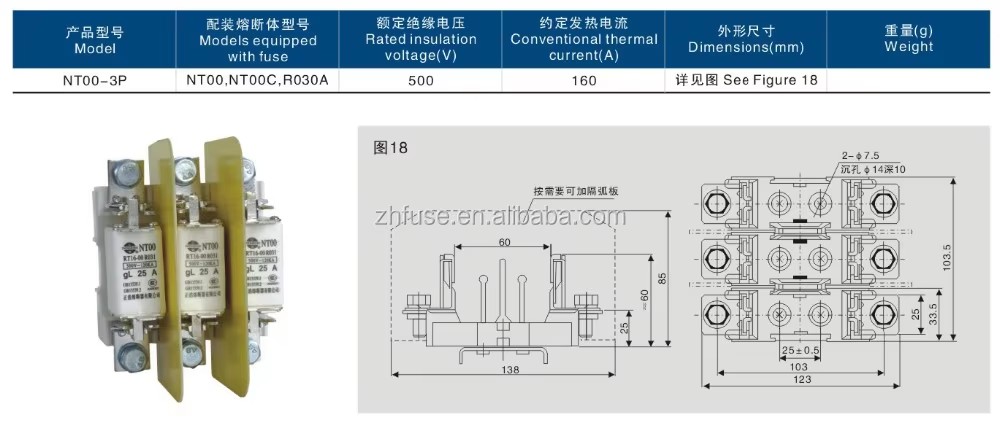 Zhenghao هم تأمین کننده ، تولید کننده و معامله گر است و خدمات سفارشی سازی کامل و طراحی را در داخل کشور و بین المللی ارائه می دهد. پایه فیوز NT00-3P مجهز به انواع فیوز مانند NT00 ، NT00C ، R030A و غیره است ، با ولتاژ عایق بندی شده حداکثر 500 ولت و یک جریان گرمایش مشخص 160A.it در سناریوهای مختلف قابل استفاده است.
