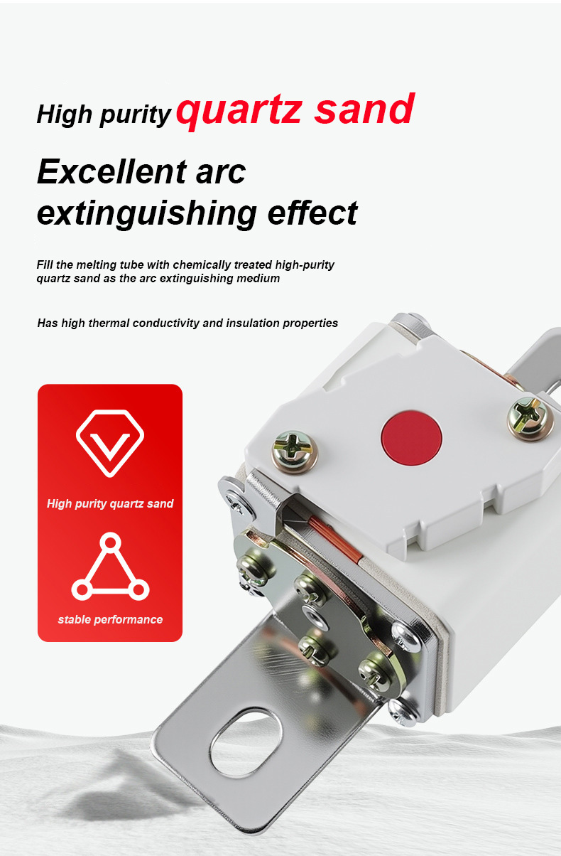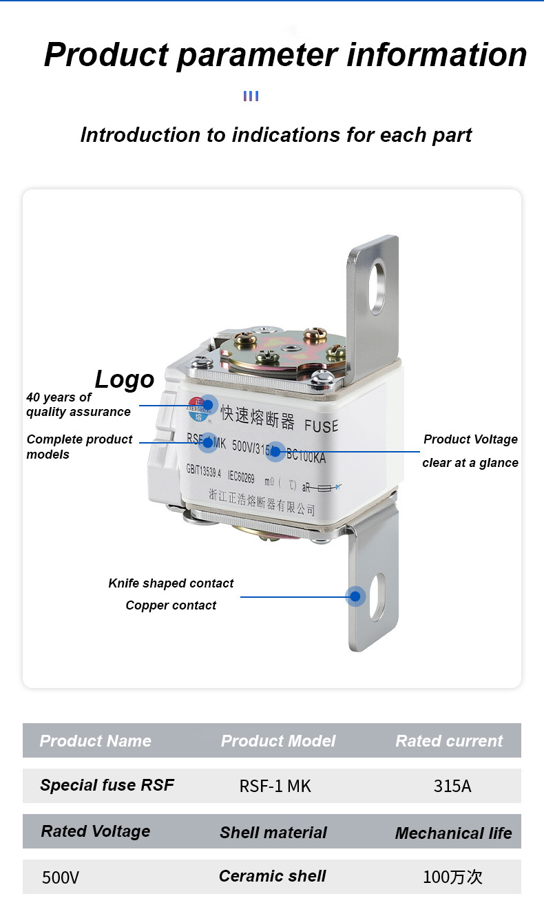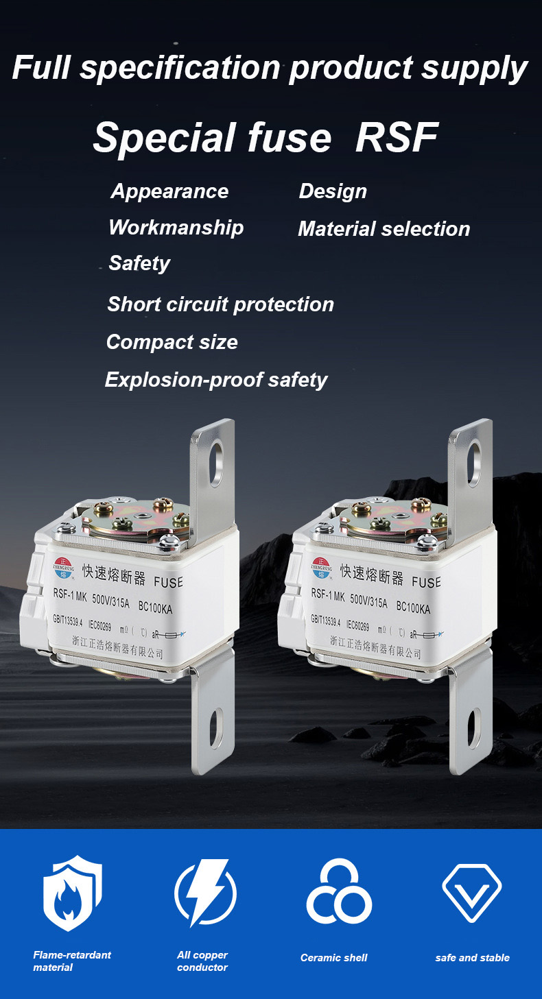 دارای ولتاژ نامی 500 ولت و جریان نامی 315 آمپر است که می تواند به طور موثر ایمنی الکتریکی را تضمین کند، از اضافه بار و اتصال کوتاه جلوگیری کند. فیوزهای RSF-1K 500V-315A BC100KA